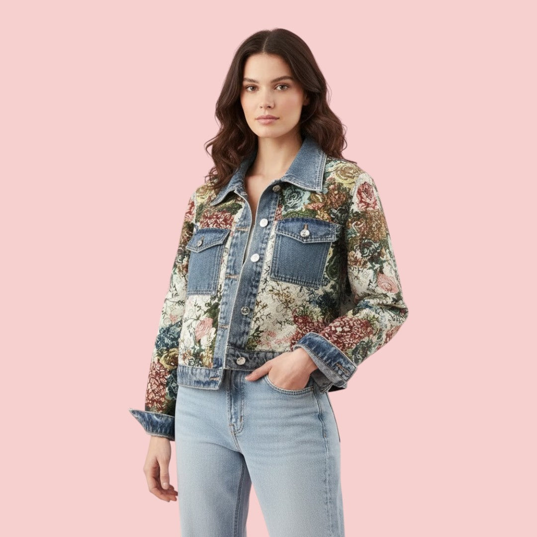 Hazel | Denim Jas met Bloemenmotief en Knopen aan de Voorkant voor Dames