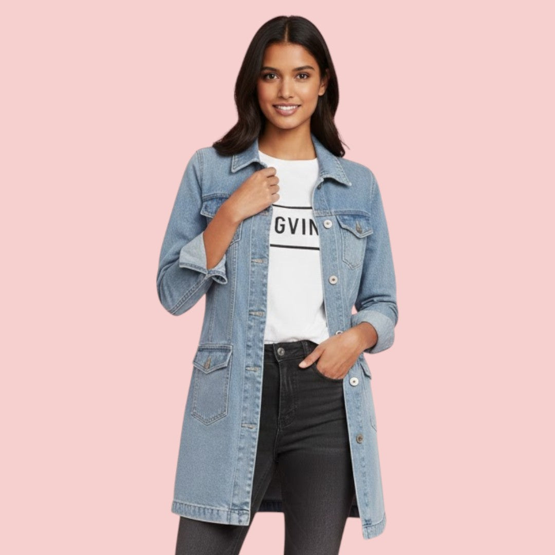 Willa | Lange Spijkerjas met Borduurdetails en Knopen aan de Voorkant voor Dames