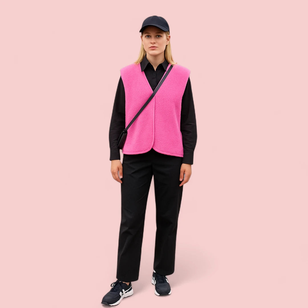 De Hazel bodywarmer heeft een rechte pasvorm en is gemaakt van teddy-materiaal met een gestructureerd oppervlak. De knoopsluiting aan de voorkant en de opstaande kraag geven het model een nette afwerking. Geschikt om te dragen over shirts of truien tijdens koelere dagen in verschillende seizoenen.