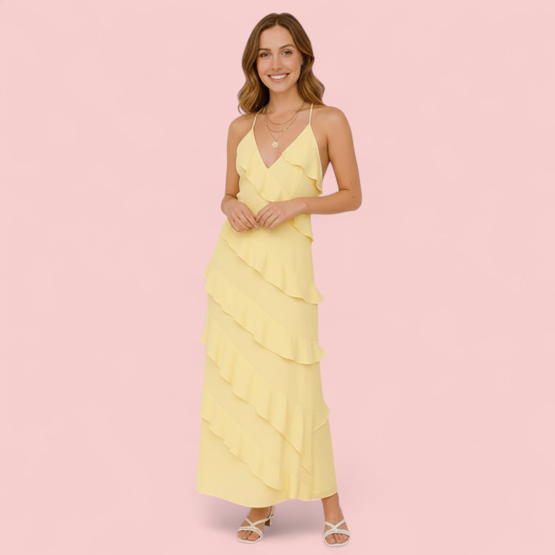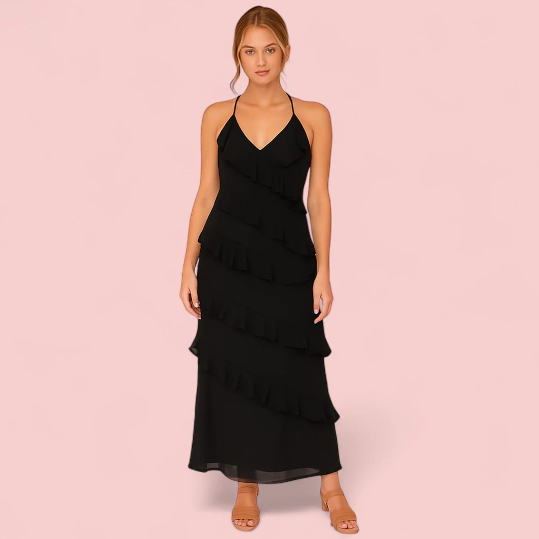 De Juliet maxi jurk heeft meerdere lagen met fijne ruches en een halterhalslijn die de schouders zichtbaar laat. De lichte stof valt gelijkmatig langs het lichaam en zorgt voor een gebalanceerde vorm. Geschikt voor zomerse dagen en formele gelegenheden, te combineren met diverse accessoires.