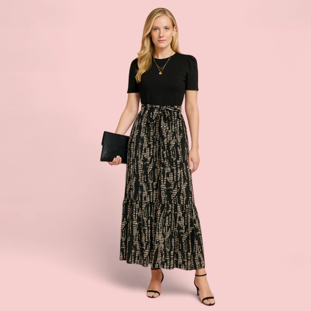 De Maya midi jurk heeft een rechte snit met ceintuur in de taille die de vorm accentueert. De stof valt gelijkmatig langs het lichaam en toont een grafisch patroon over het gehele ontwerp. De pofmouwen voegen structuur toe aan de bovenkant. Geschikt voor werk, bijeenkomsten of informele gelegenheden.