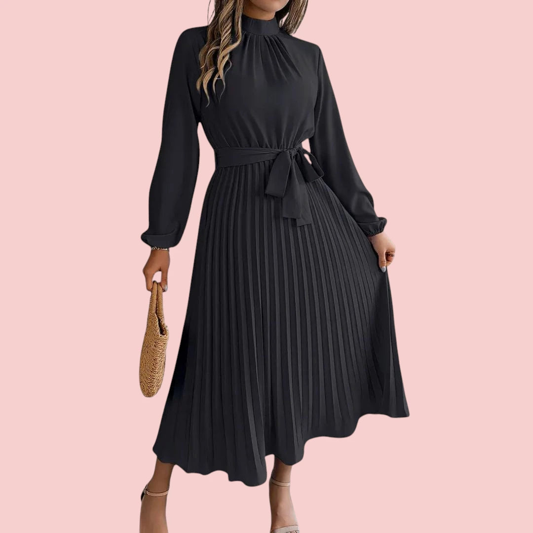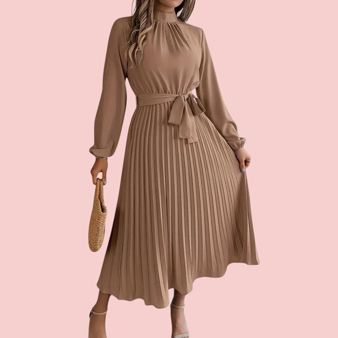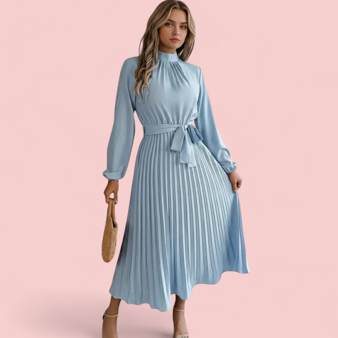 De Renee midi jurk heeft een hoge halslijn en lange mouwen. De plissérok geeft structuur en beweging aan het ontwerp, terwijl de strikceintuur in de taille zorgt voor een nette pasvorm. De lichte stof valt gelijkmatig langs het lichaam. Geschikt voor werk, bijeenkomsten of formele gelegenheden.
