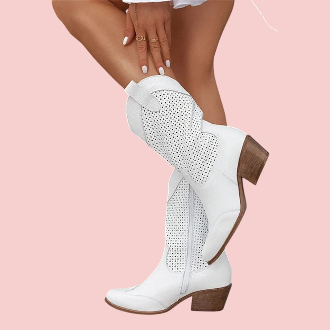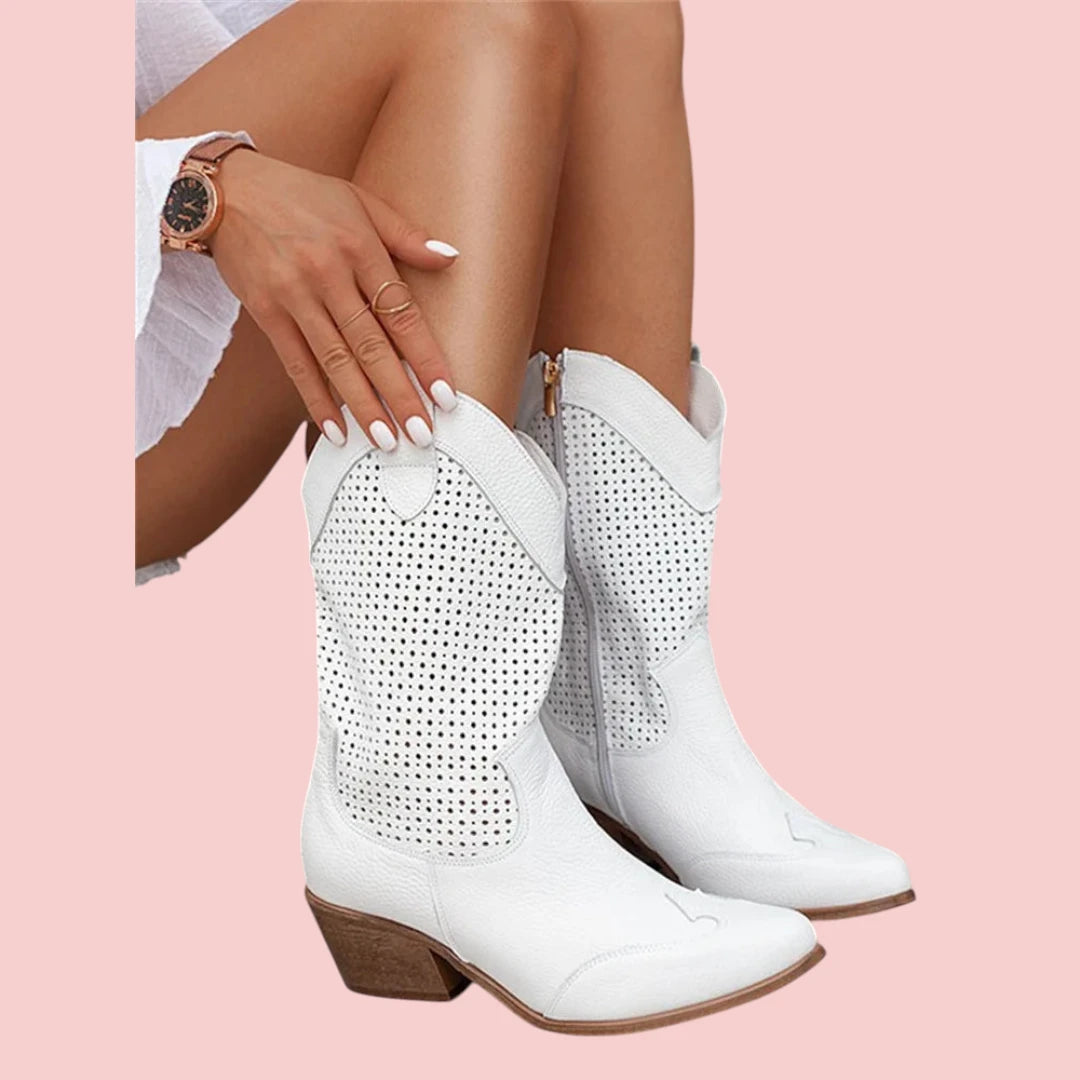 Deze dames westernlaarzen zijn uitgevoerd in imitatieleer met een geperforeerd ontwerp op de schacht. Het model heeft een halflange hoogte, een lage hak en een ritssluiting aan de zijkant. De zool heeft een stevige opbouw voor stabiliteit, waardoor de laarzen geschikt zijn voor dagelijks gebruik of informele gelegenheden.