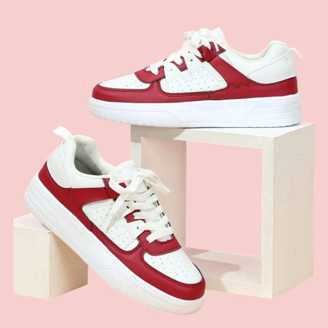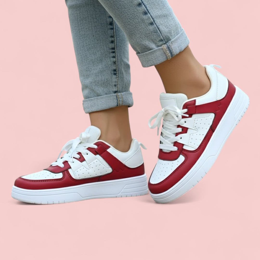 Deze dames sneakers hebben een sportieve uitstraling en zijn uitgevoerd in wit met contrasterende rode panelen. Het bovenwerk heeft een geperforeerde structuur voor luchtcirculatie, gecombineerd met een gelijkmatig afgewerkte binnenzijde. De dikke rubberen zool biedt stabiliteit en een eigentijdse vorm, geschikt voor dagelijks gebruik en informele outfits.
