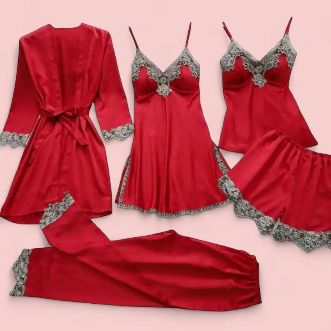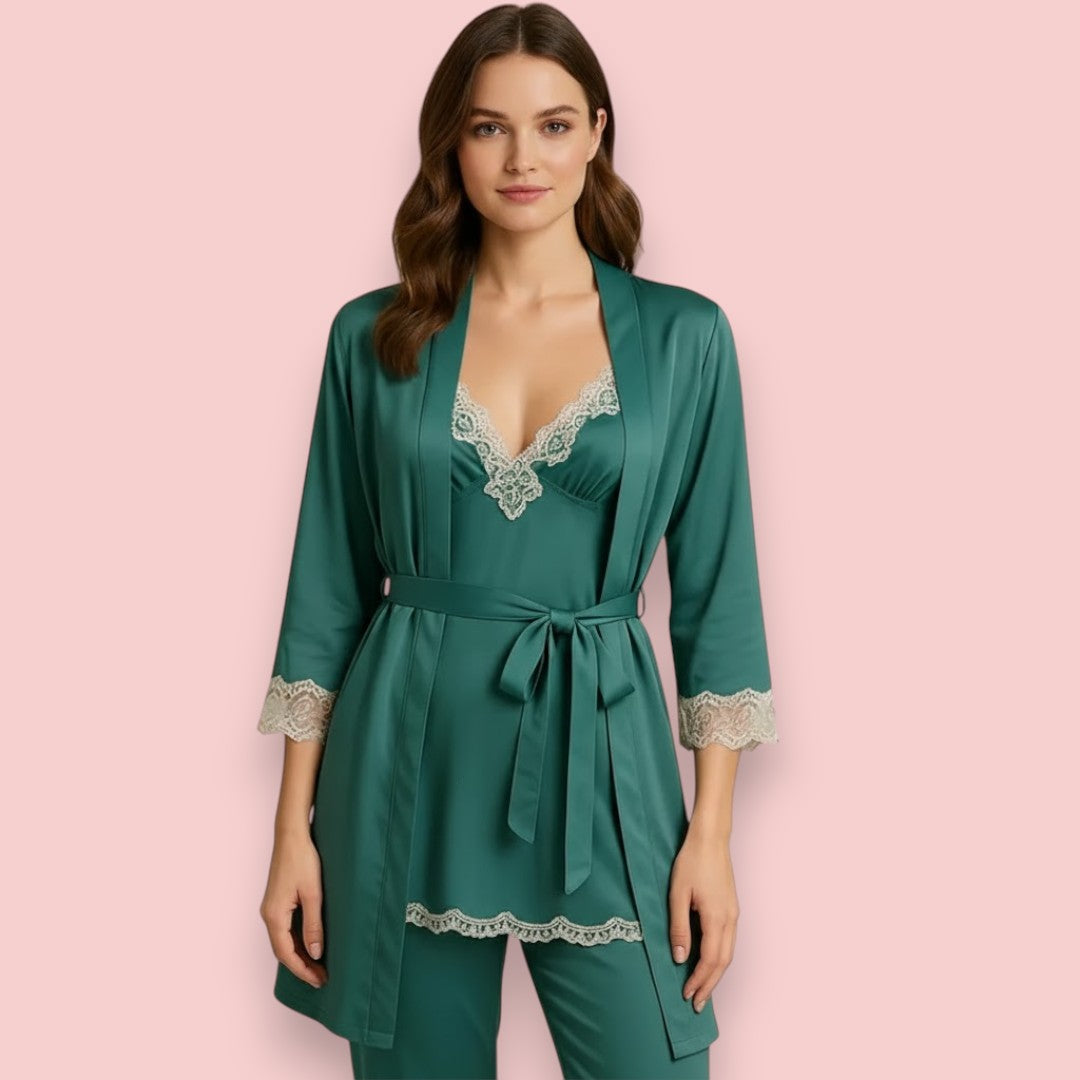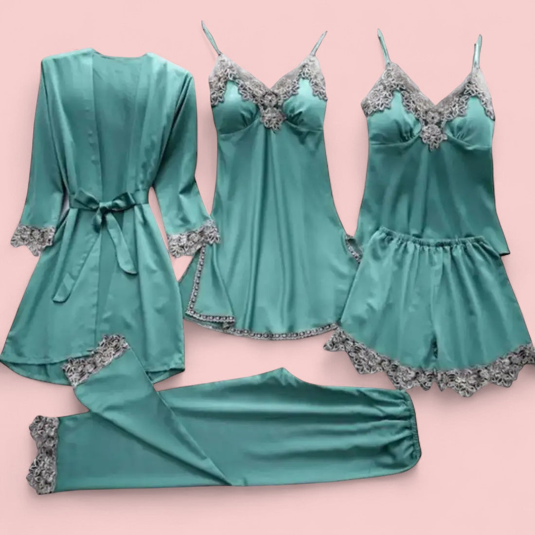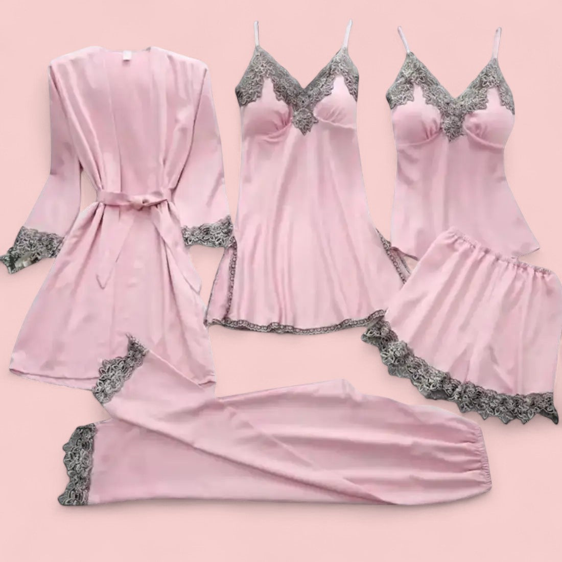 Emily | Satijnen Pyjamaset Met Kantdetails En Ceintuur In 5 Delen