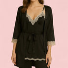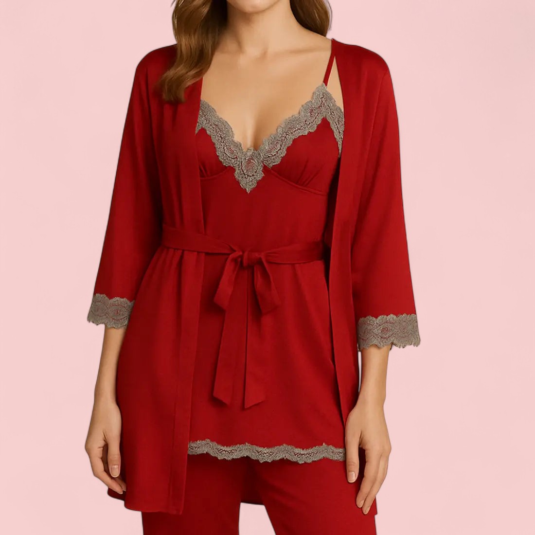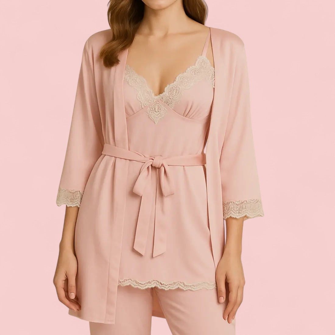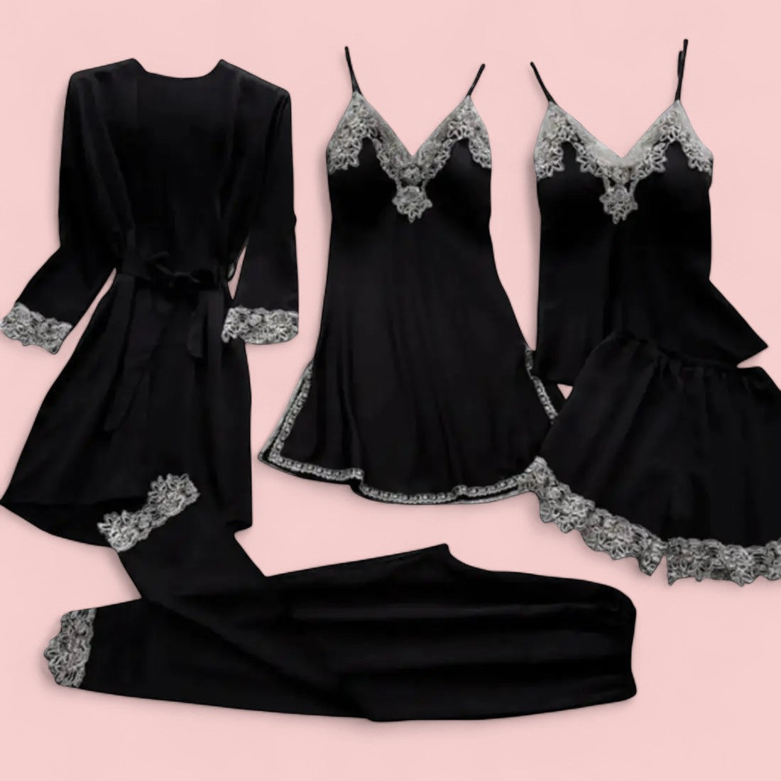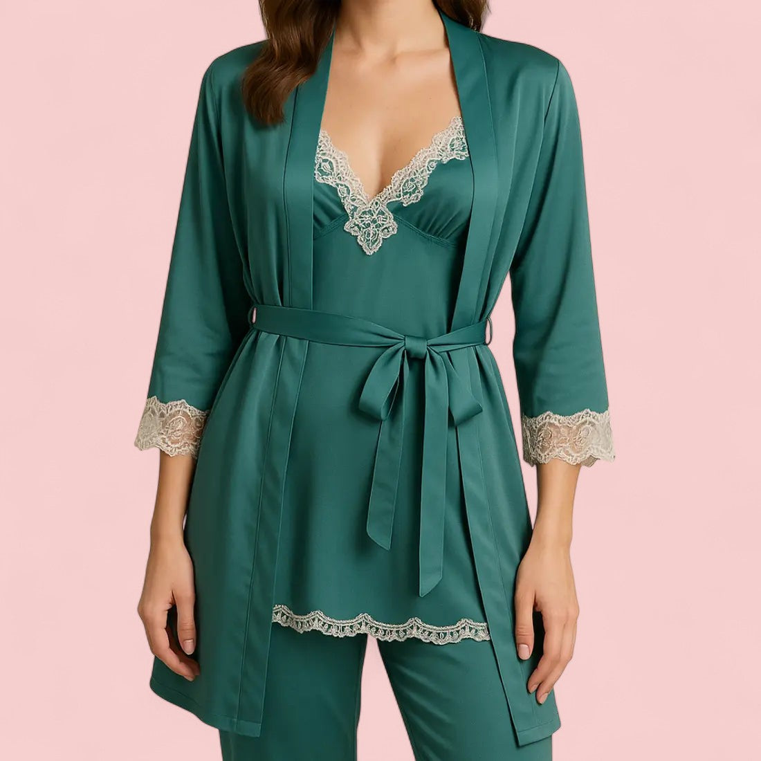 Emily | Satijnen Pyjamaset Met Kantdetails En Ceintuur In 5 Delen