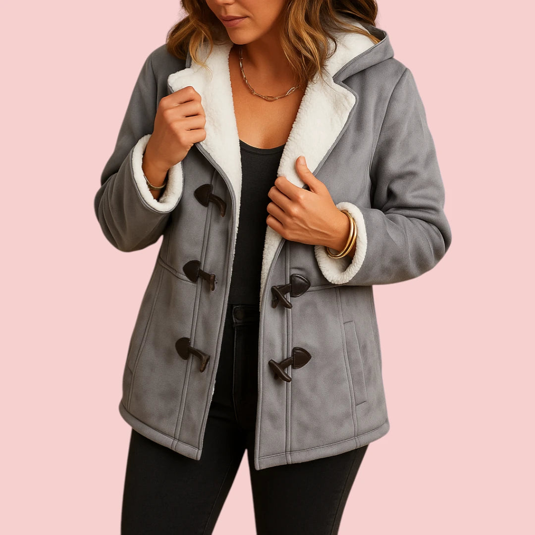 Deze dameswinterjas heeft een rechte pasvorm en een capuchon voor extra bedekking. De jas is voorzien van een dikke voering en een sluiting met houten toggles. De binnenzijde is contrasterend afgewerkt, wat het ontwerp een duidelijk gelaagd effect geeft. Geschikt voor dagelijks gebruik tijdens koudere dagen.